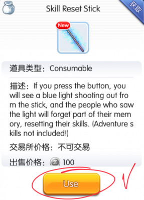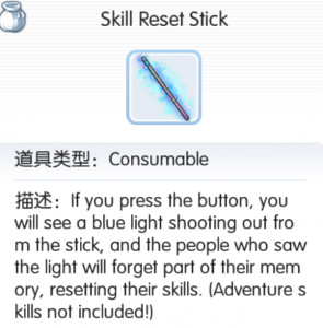 Для сброса умений, используйте Skill Reset Stick непосредственно из инвентаря